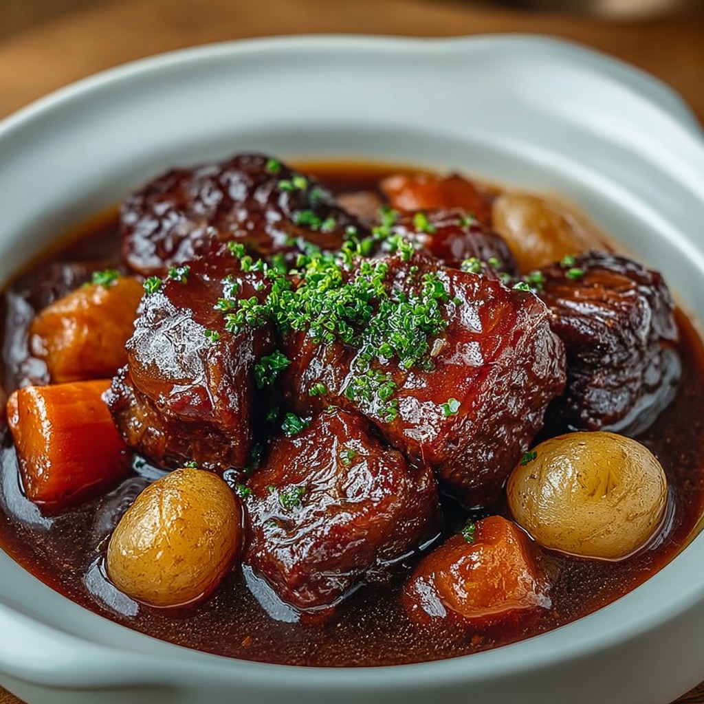 La joue de bœuf braisée au vin rouge et carottes fondantes est un plat emblématique de la cuisine française, riche en saveurs et réconfortant. La viande, longue à cuire, devient extrêmement tendre et fondante, imprégnée des arômes du vin rouge et des légumes. Les carottes apportent douceur et couleur, tandis que la sauce réduite offre un velouté profond et parfumé. Ce plat est idéal pour un repas familial, un dîner convivial ou une occasion spéciale.