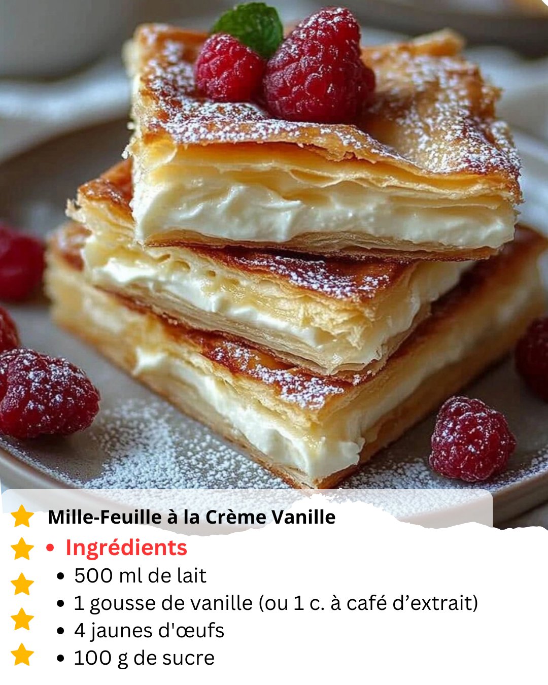 Le mille-feuille, ce grand classique de la pâtisserie française, séduit par ses couches croustillantes de pâte feuilletée et sa crème vanille onctueuse. Raffiné mais étonnamment simple à préparer à la maison, il promet une explosion de textures et de saveurs à chaque bouchée. Parfait pour impressionner vos invités ou simplement pour vous faire plaisir avec une douceur élégante.