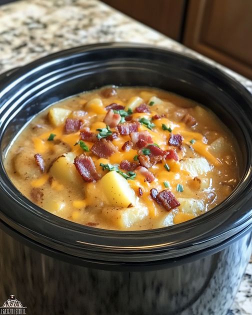 La soupe de pommes de terre au four à la mijoteuse est un plat réconfortant qui allie l’essence même de la pomme de terre au four classique à une soupe chaude et onctueuse. Issue de la modeste pomme de terre, un aliment de base dans de nombreuses cuisines, cette soupe allie les riches saveurs du bacon, du fromage et de la crème fraîche, ce qui en fait un repas copieux idéal pour les journées fraîches. C’est un excellent choix pour les personnes pressées qui souhaitent un délicieux repas maison sans passer des heures en cuisine, grâce à la commodité d’une mijoteuse.