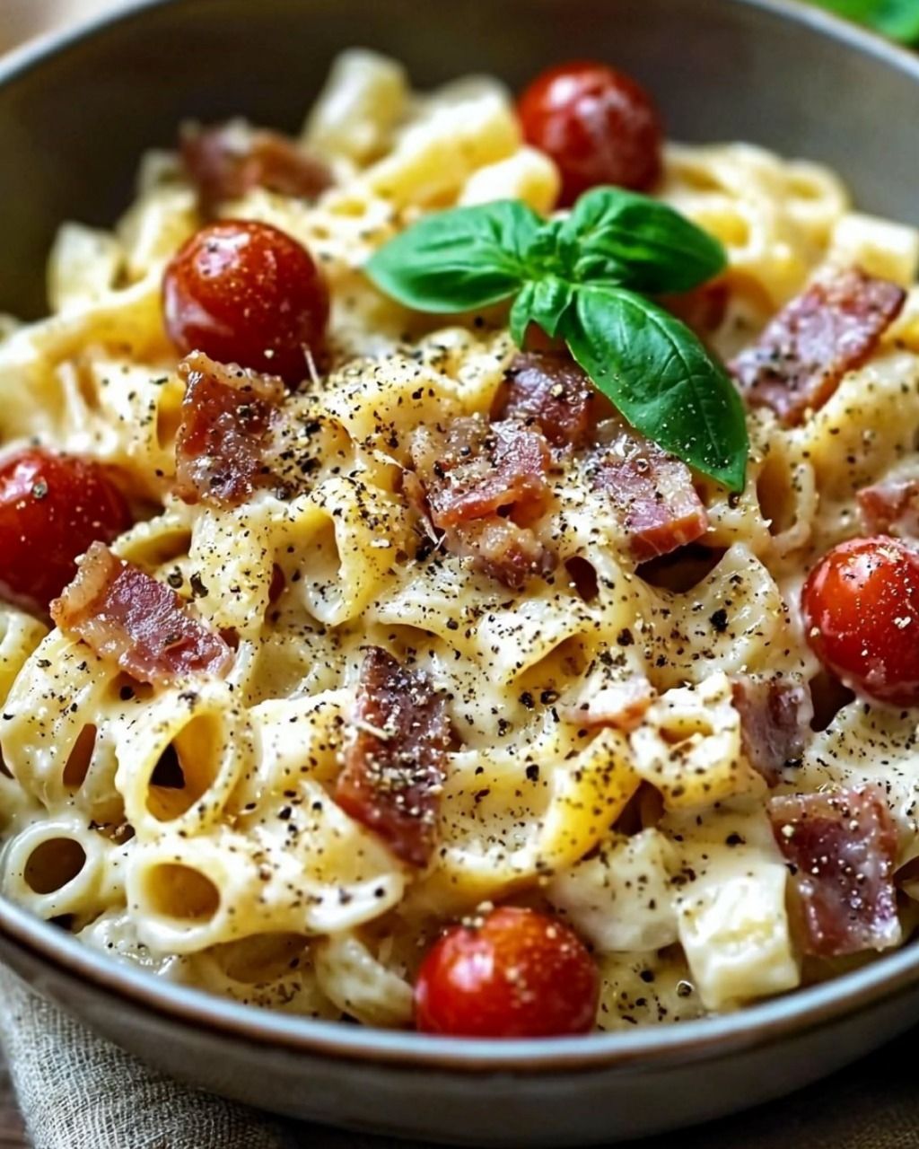 Assiette de pâtes crémeuses au Boursin et lardons, parsemée de persil frais et servie avec des tomates cerises.