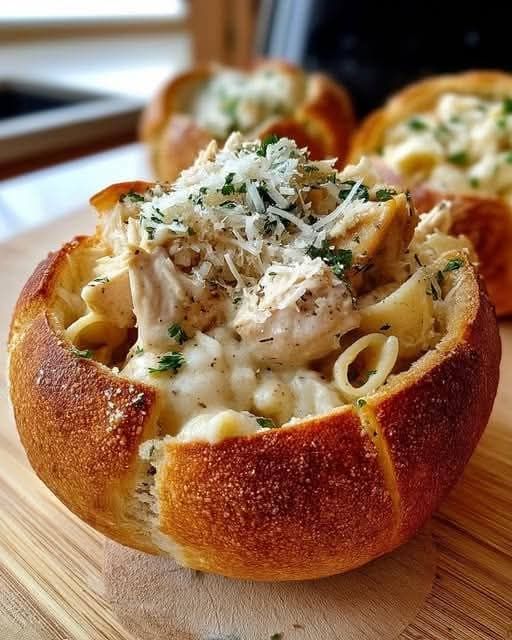 Imaginez un dîner chaleureux et réconfortant : du poulet tendre, des pâtes onctueuses à la sauce Alfredo, le tout servi dans un bol de pain croustillant et parfumé à l’ail. Ce plat réunit tout ce qu’on aime : du moelleux, du crémeux et du croquant, parfait pour impressionner votre famille ou vos invités lors d’une soirée décontractée !