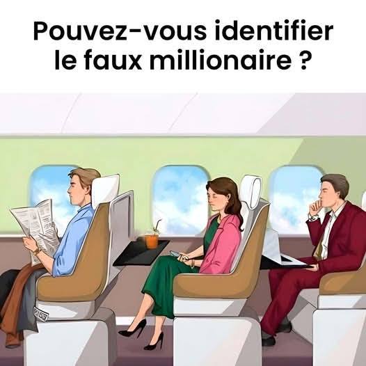 Dans un avion imaginaire, trois passagers attirent l’attention : parmi eux, se cache un imposteur. Mais qui est-il ? Cette énigme visuelle mettra vos compétences d’observation à l’épreuve. Parviendrez-vous à repérer les indices qui trahissent le faux millionnaire ? Prenez le temps d’analyser chaque détail… La solution pourrait bien vous étonner.