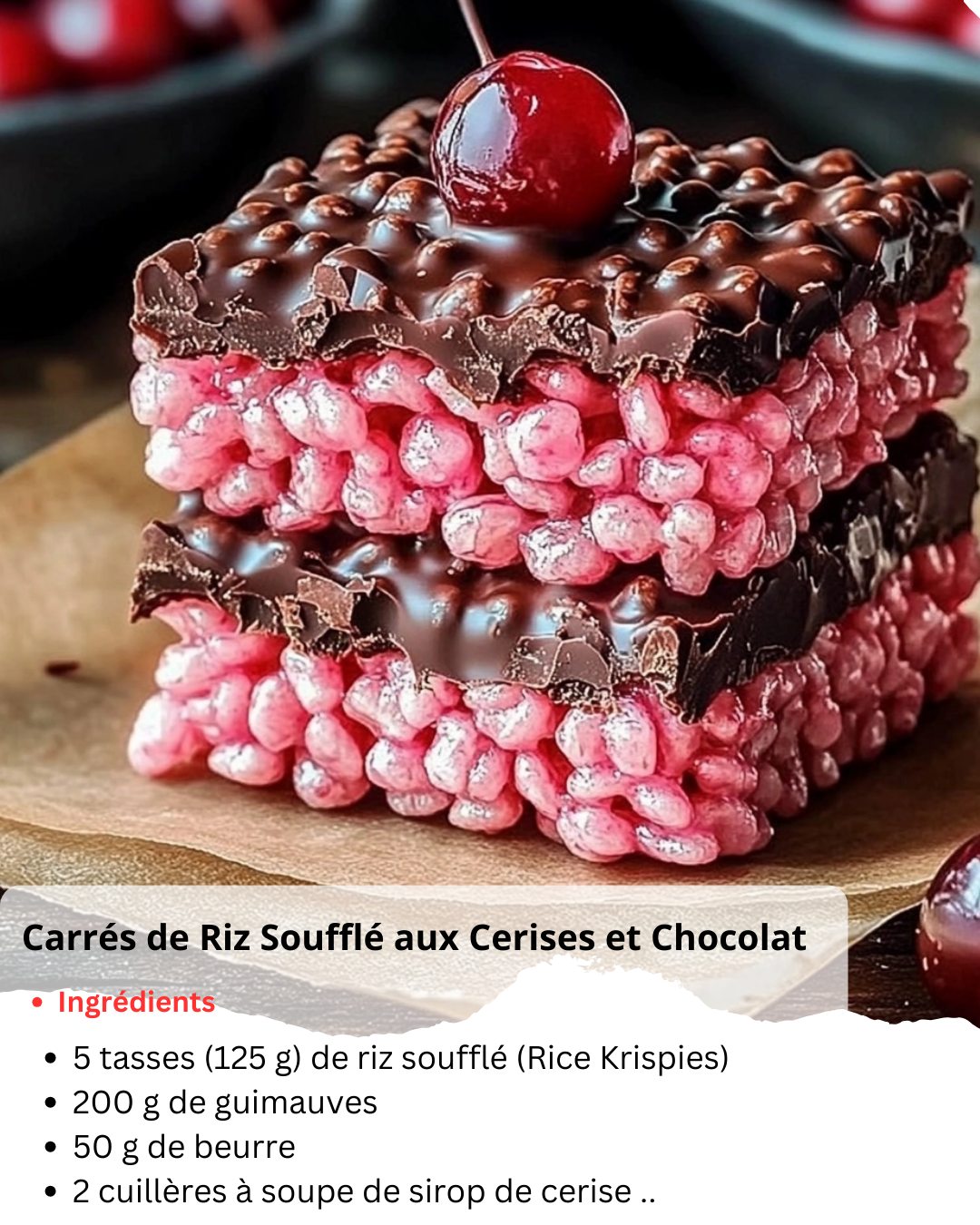 Ces carrés de riz soufflé aux cerises et chocolat sont une véritable gourmandise ! À la fois croquants et fondants, ils allient la douceur des guimauves, le croquant du riz soufflé et l’intensité du chocolat. Leur belle teinte rosée, obtenue grâce au sirop de cerise, en fait un dessert aussi joli que délicieux. Parfaits pour une collation festive ou un goûter original, ils se préparent facilement et sans cuisson !