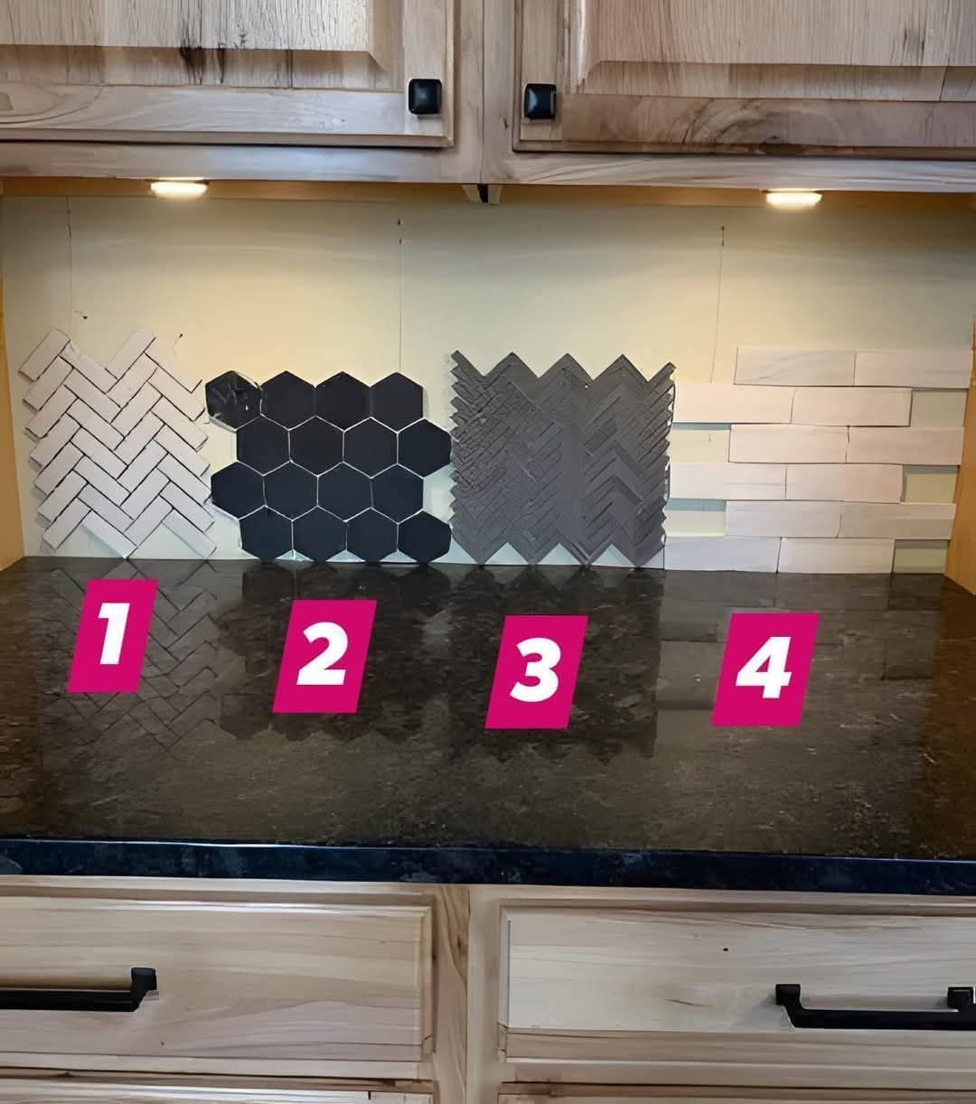 Dans cette image, on découvre quatre options de dosserets installées pour test dans une cuisine aux armoires en bois naturel et au comptoir en granit noir. Le bon choix de dosseret peut complètement transformer l’atmosphère d’une cuisine. Voici une analyse complète des options proposées :